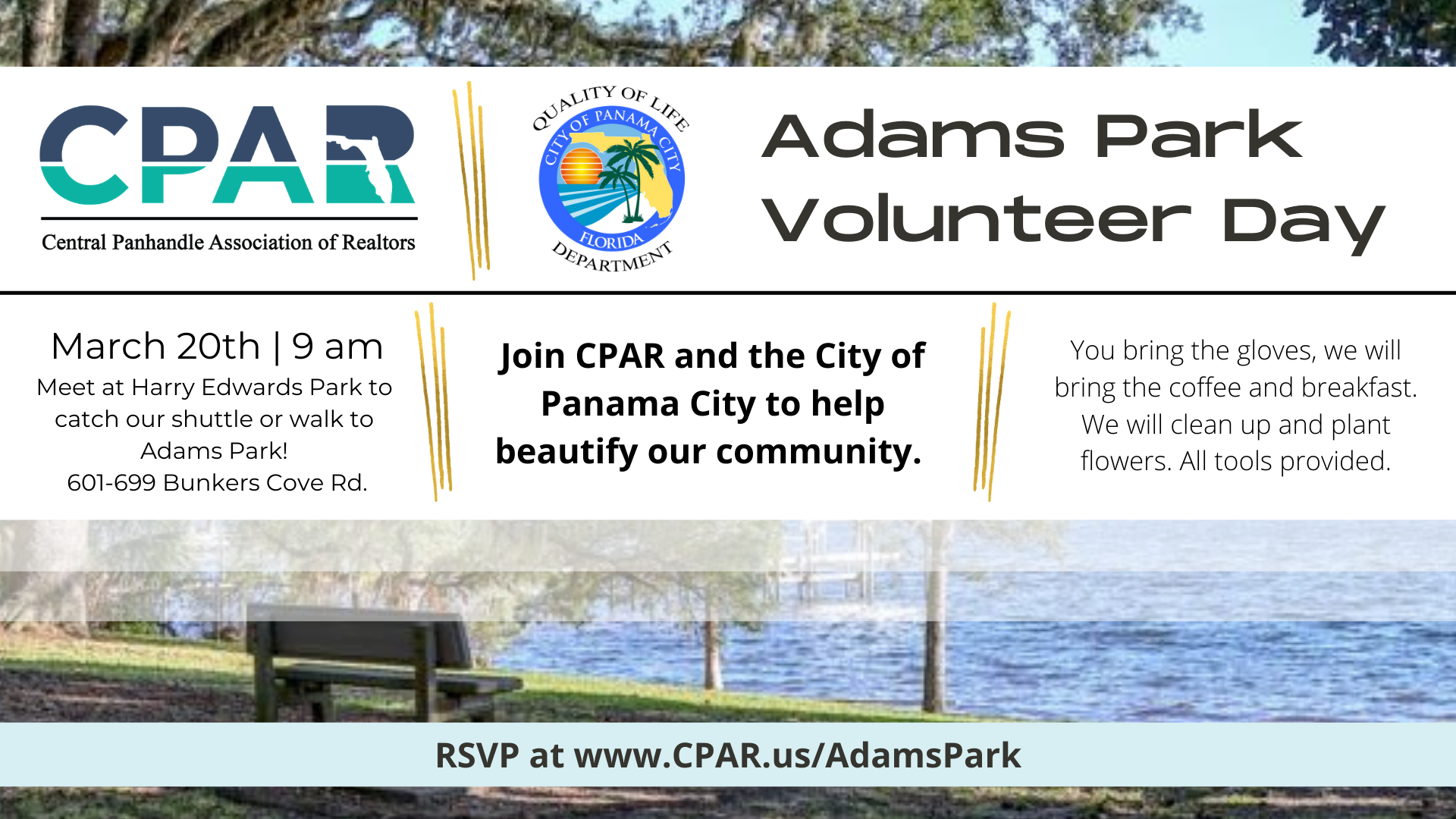 On the morning of March 20th, REALTORS® and volunteers will meet up at 9 am in the St. Andrews Bay Yacht Club parking lot where we will be shuttled to the park. The City of Panama City will provide all tools necessary for planting flowers and CPAR will bring the coffee, water, and light breakfast. Grab your gardening gloves and join us as we lead the way in improving our little piece of paradise, one place at a time. Parking is limited at Adams Park. Volunteers can RSVP at www.CPAR.us/AdamsPark