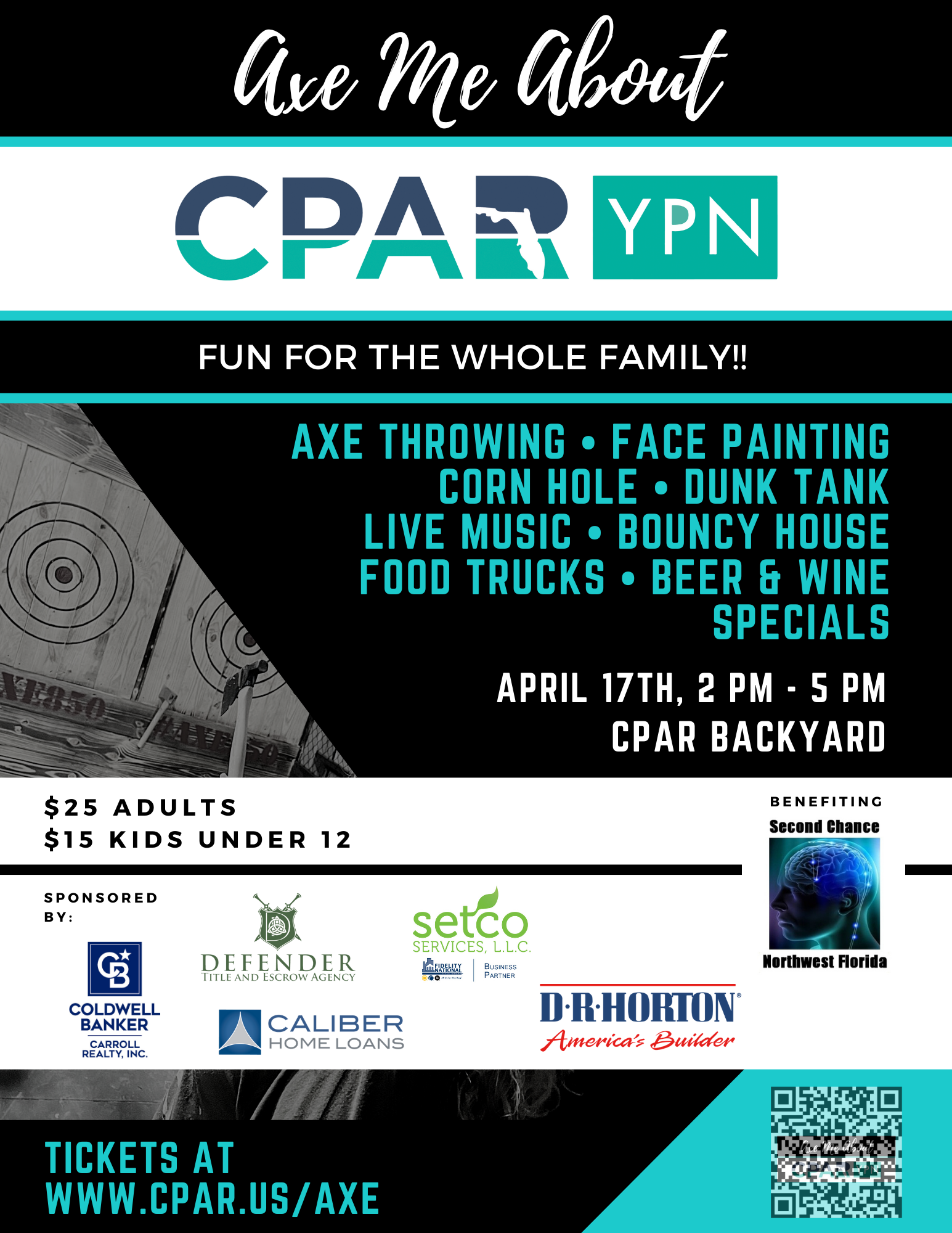 On April 17th, The Central Panhandle Association of REALTORS® Young Professionals are asking you to join us, have some fun and support an amazing local charity. “Axe Me About YPN” is a ticketed event that will feature axe throwing, corn hole, a dunk tank, face painting, live music and more. The event will start at 2 pm and last until 5 pm. All these activities are included in the ticket price and support Second Chance of Northwest Florida.