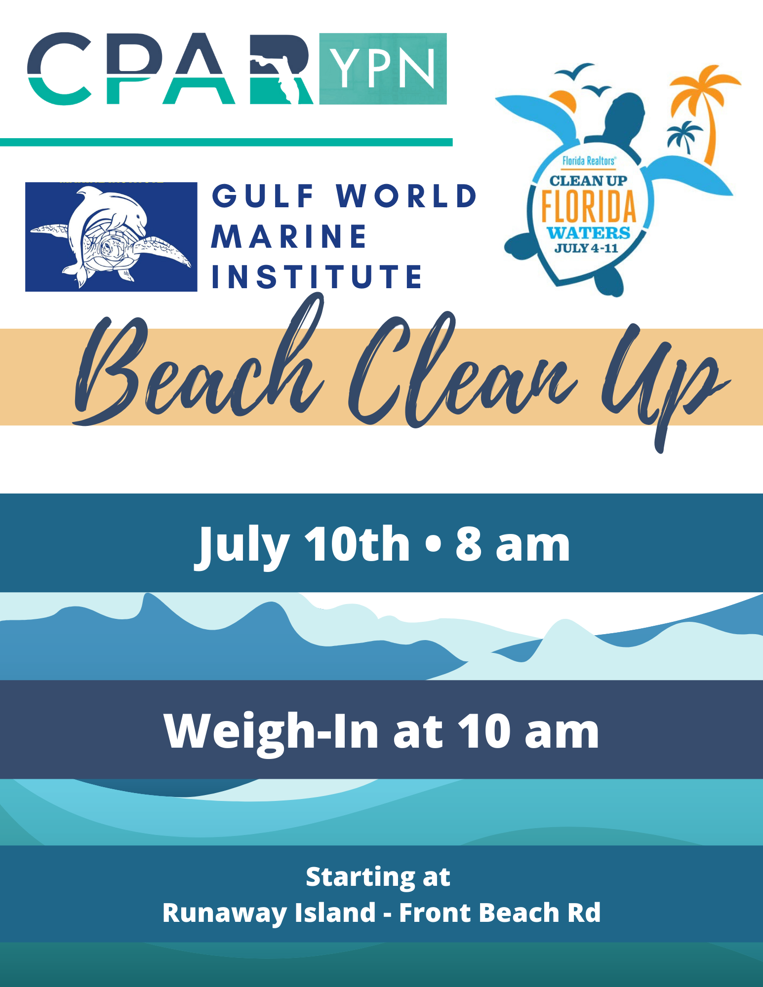 Panama City Beach, FL – The Young Professionals Network at the Central Panhandle Association of REALTORS® (CPAR YPN) is joining forces with the Gulf World Marine Institute (GWMI) on July 10th to host a Beach Clean Up on Panama City Beach. CPAR YPN and GWMI will gather behind Runaway Island Beachfront Restaurant at 8 am to distribute buckets, gloves, water, and more to all who would like to contribute to the effort. All participants can weigh-in their collected items at 10 am.