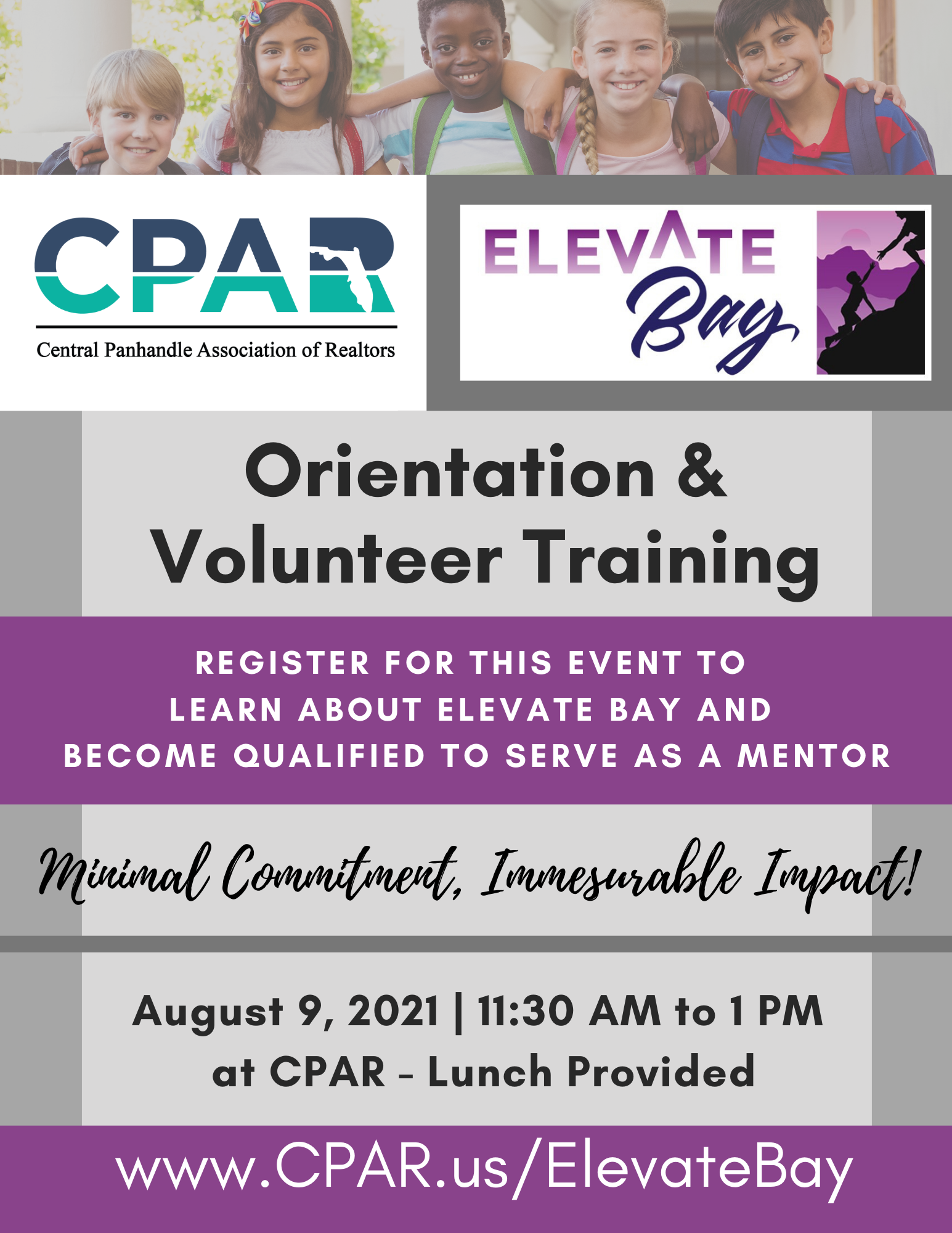 On August 9, 2021, local charity organization Elevate Bay will visit the Central Panhandle Association of REALTORS® to welcome and educate new volunteers on the meaningful and selfless work they do to help Bay District School Students. They are holding an orientation, and volunteer training session in the CPAR Classroom from 11:30 am to 1 pm to introduce their volunteer opportunities for the 2021- 2022 school year.