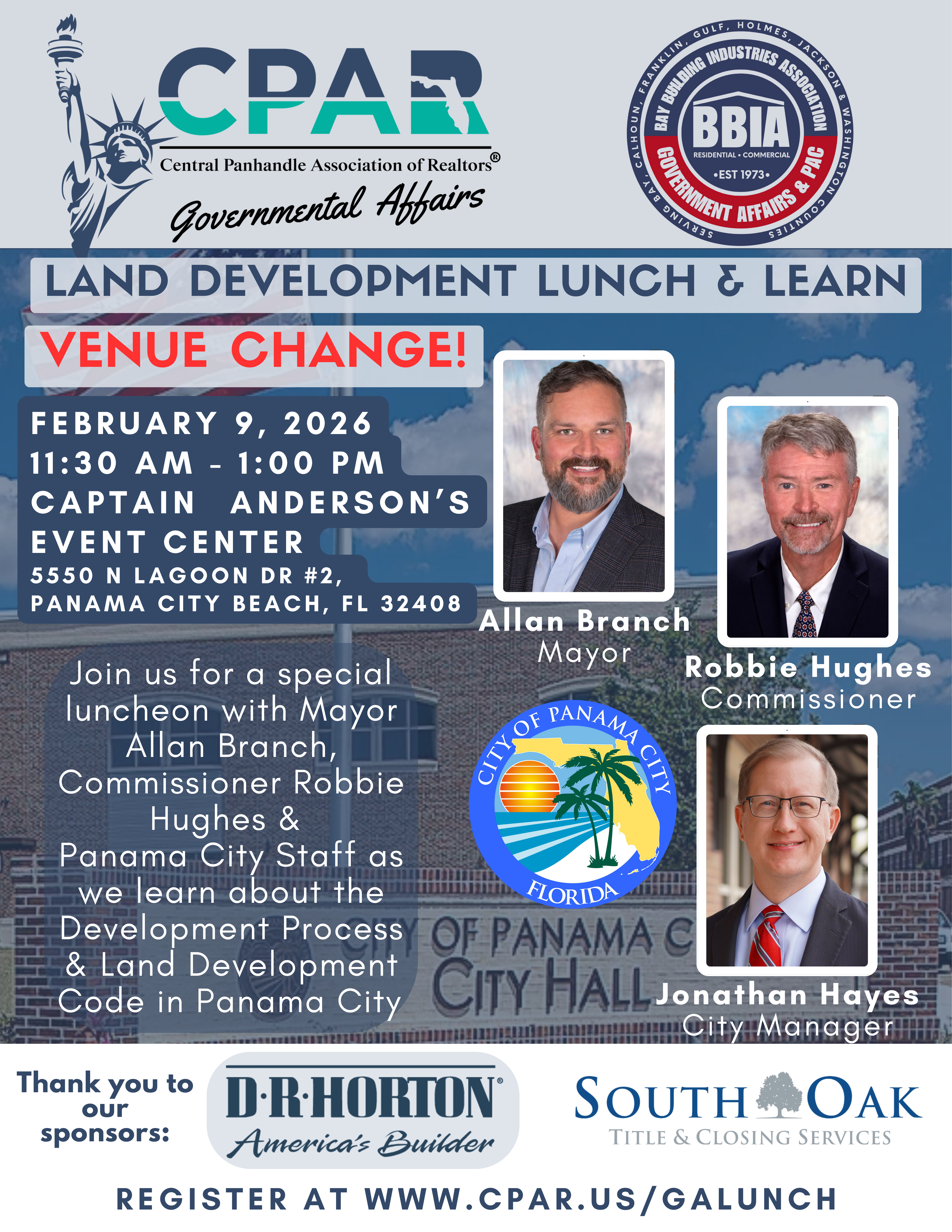 Lunch will be served as we hear directly from Panama City Mayor Allan Branch, Panama City Commissioner Robbie Hughes, and Panama City Staff, who will provide insight into the development process and discuss current and upcoming considerations impacting land development in our community.