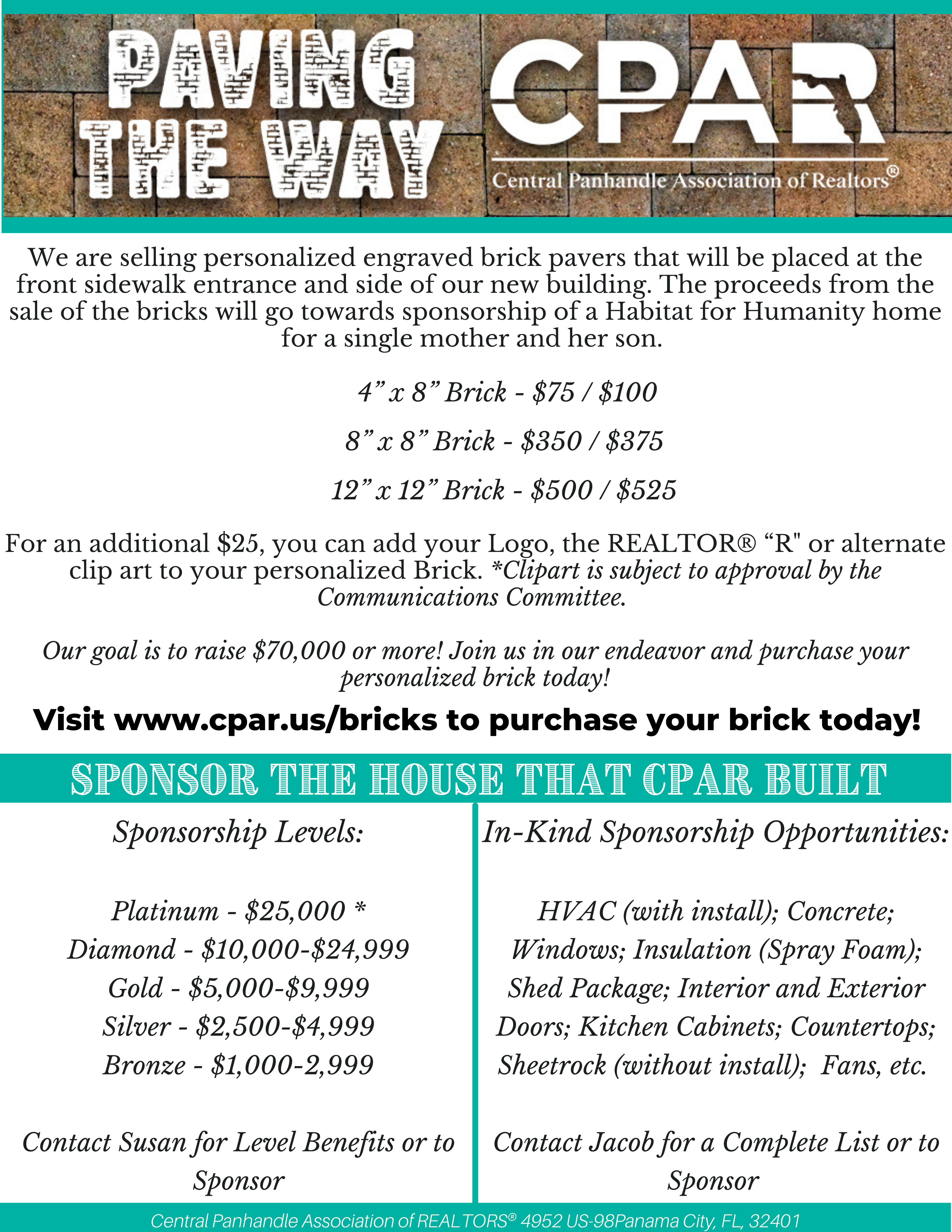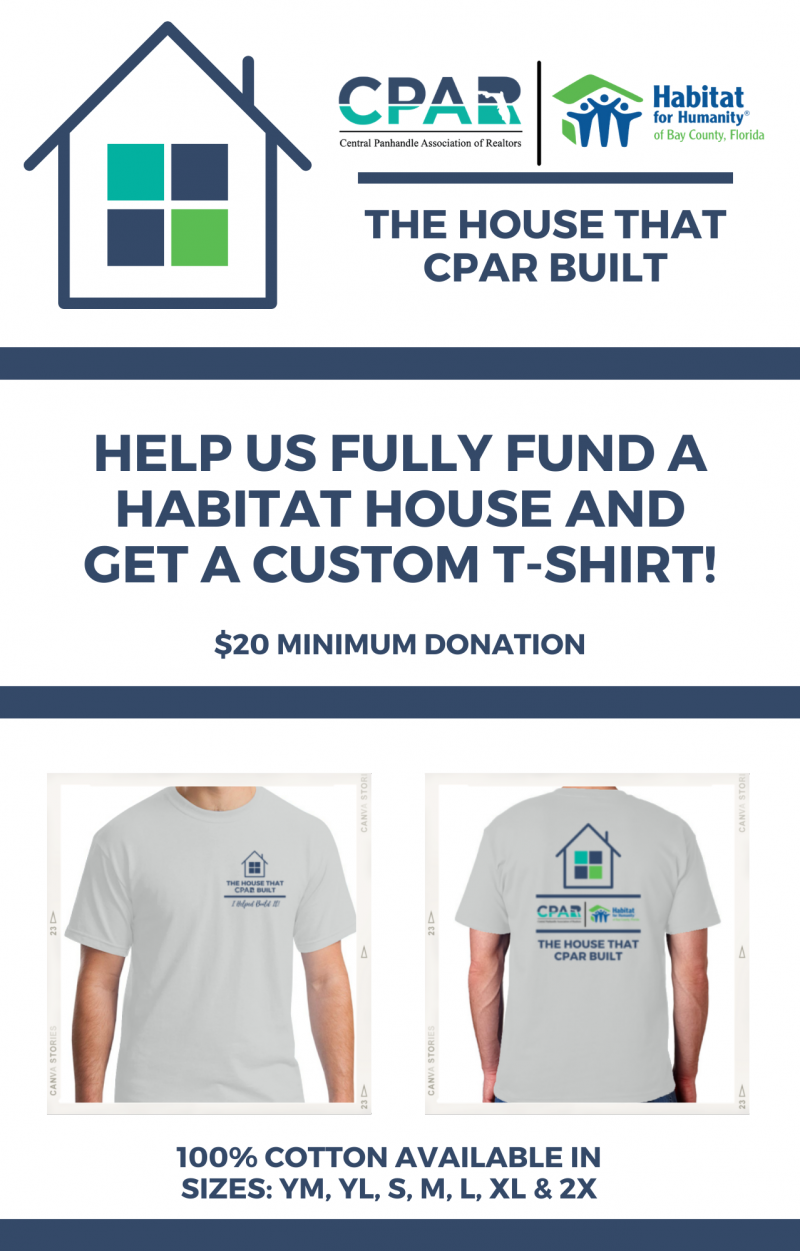 County chapter of Habitat for Humanity to fully sponsor a Habitat House! See below for various ways to donate. Our goal is $70,000 to fully fund a house! Pick up your shirts at CPAR or opt for shipping!